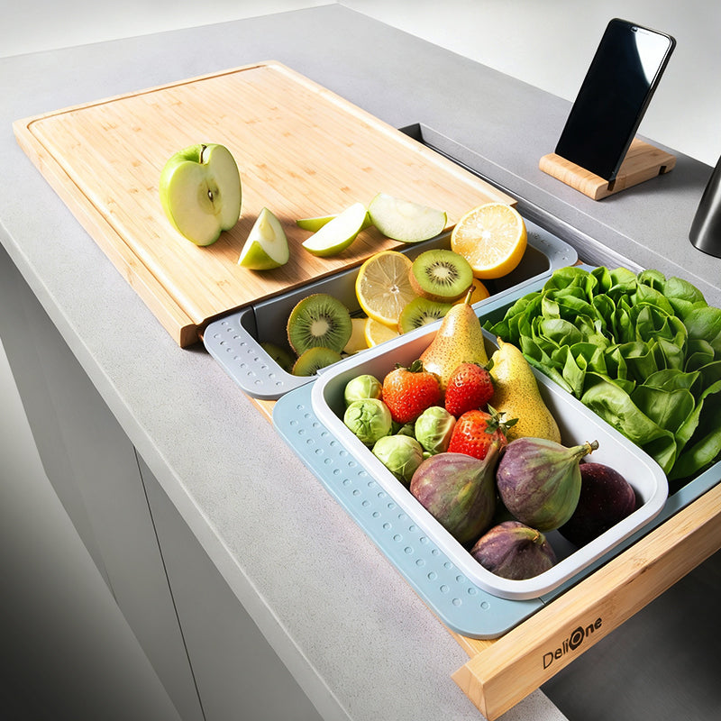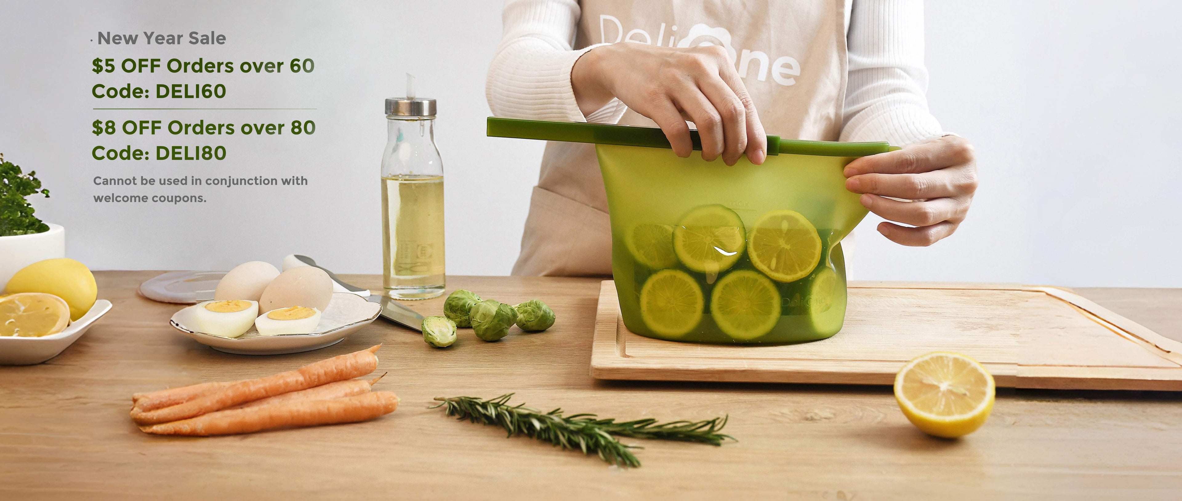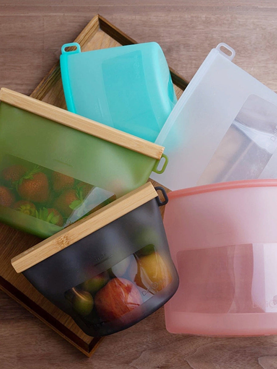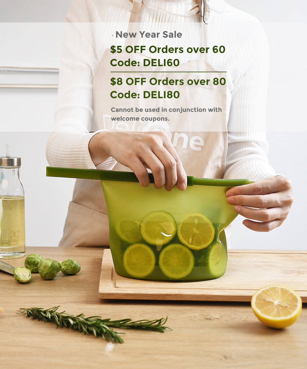 DeliOne silicone food storage containers and stretch lids on a neutral kitchen surface