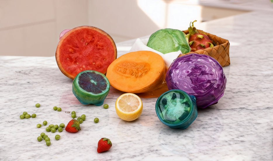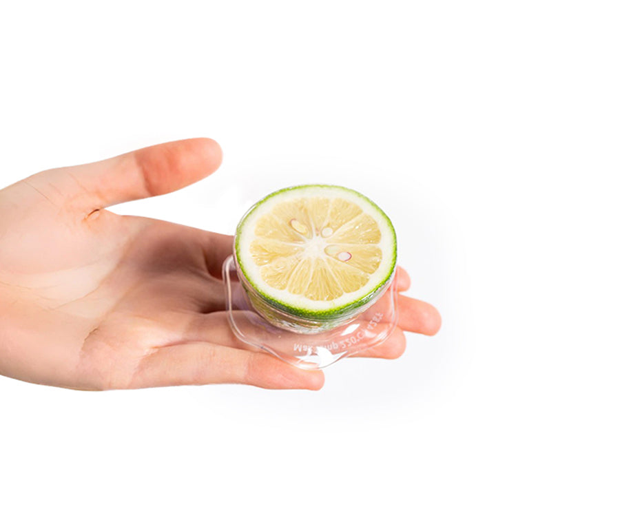 Hand holding a DeliOne Flex'n Fresh Stretch Lid covering half a lemon